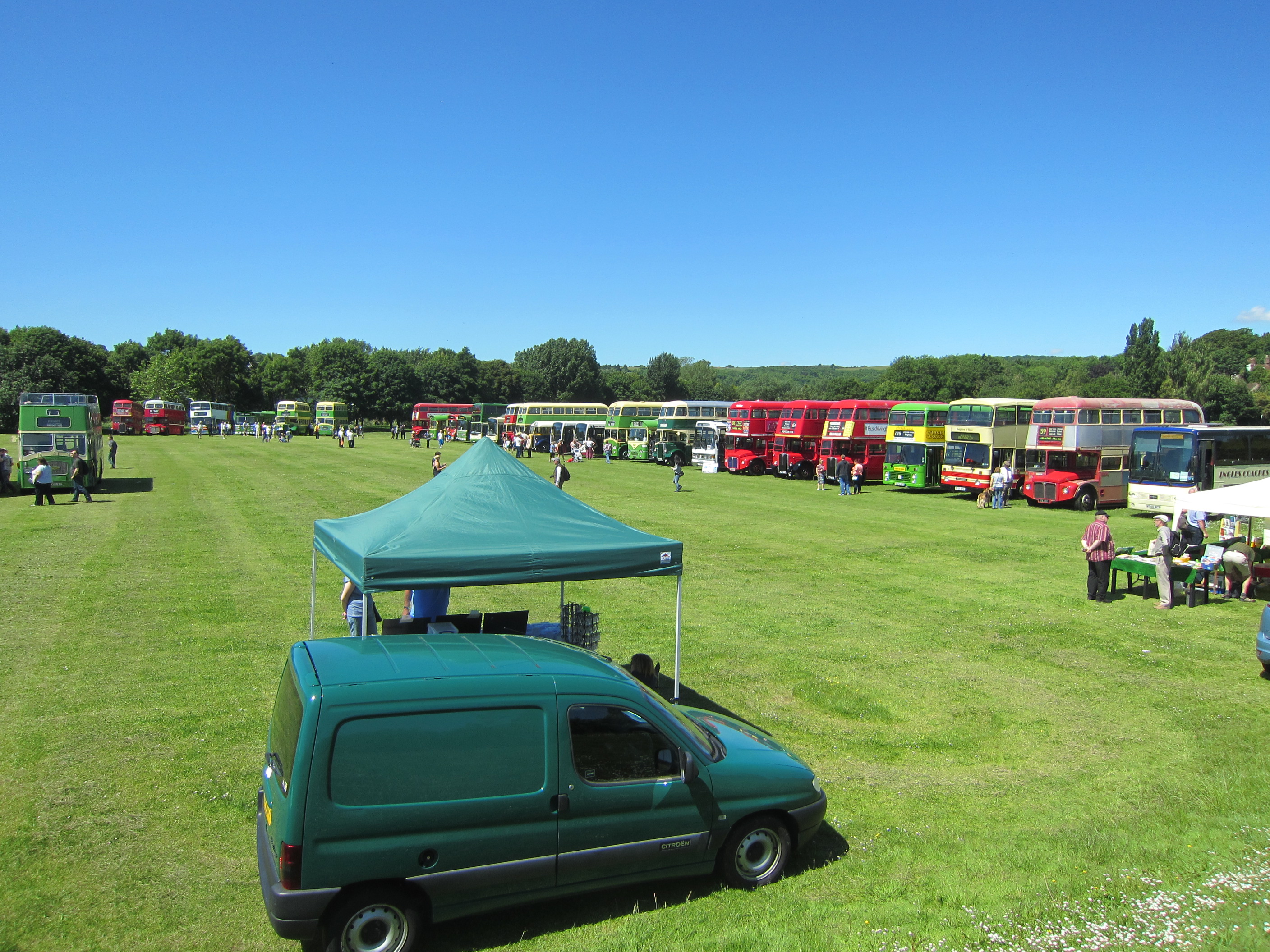 The weather was certainly kind to us as we set up our gazebo and sales stand at the Lewes Bus Rally. The previous day had seen heavy, localised rain and we fully expected to find a waterlogged field on which to erect the gazebo but no, the sun had dried things out, the river was bubbling along in its bed and there were no muddy puddles to catch us out.