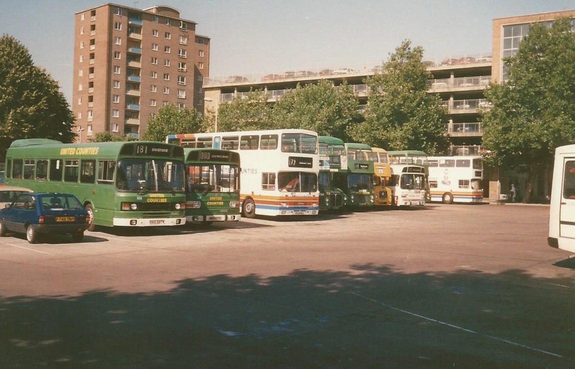 United Counties buses in the layover space at Bedford, 1989. The corporate image of Stagecoach is slowly creeping in.... Stagecoach